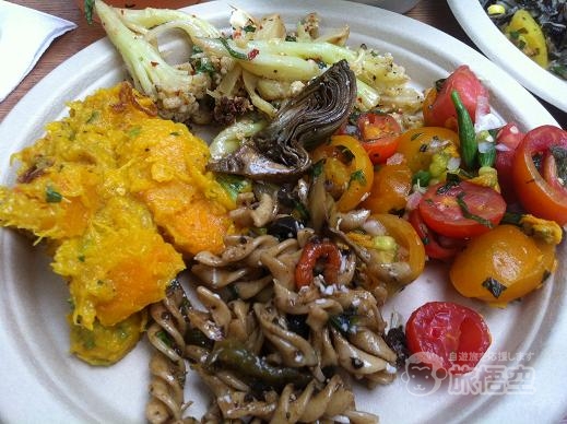 時計回りに、カリフラワー&アンティーチョークのサラダ、トマトサラダ、パスタ、かぼちゃサラダ。