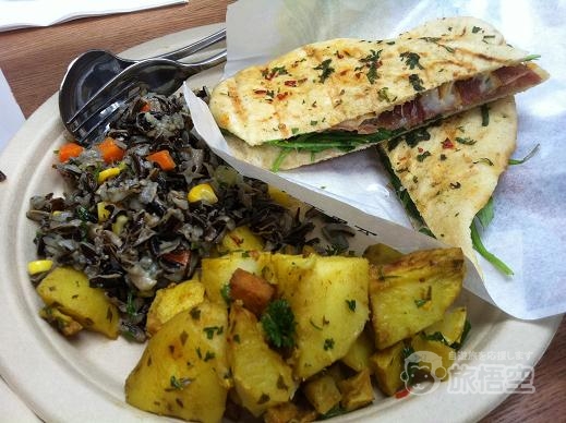 プロシュートのパニーニ、ポテト、ワイルドライスサラダ。